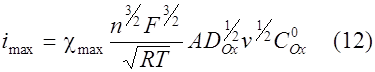 Найденная любым из приведенных способов функция определяет форму вольтамперных кривых в случае обратимого электродного процесса. Уравнение тока пика легко получили на основе уравнения (7) и графика функции (8 - 11). Это выражение известно как уравнение Рендлса - Шевчика: