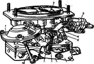 І 1-пневмопривід дросельної заслінки вторинної камери; 2-повітрянка заслінка; 3-діафрагментний пусковий пристрій; 4- важіль; 5 - телескопічної тяги; 6-важіль привід дросельної заслінки первинної камери; 7-важіль, що обмежує відкриття дросельної заслінки вторинної камери; 8-поворотна пружина; 9- тяга, що зв'язує дросельну заслінку, первинної камери з важелем; 10 -шток пневмопривода. Рисунок 11- Схема карбюратора 2107-1107010-20. З поплавкової камери ( рисунок 12) паливо через головні паливні жиклери надходить в емульсійні колодязі, змішується з повітрям, що виходить з отворів емульсійних трубок і надходять у них через головні повітряні жиклери. Потім через розпилювачі емульсія надходить у малі й великі дифузори карбюратора. Головні паливні жиклери мають маркірування, вибиту на бічній поверхні голівок (наприклад, 112 чи 150), що позначає діаметр отвору жиклера (1,12 чи 1,50 мм). Головні повітряні жиклери мають маркірування на верхній площині (наприклад, 150), що позначає діаметр жиклера (1,50 мм).