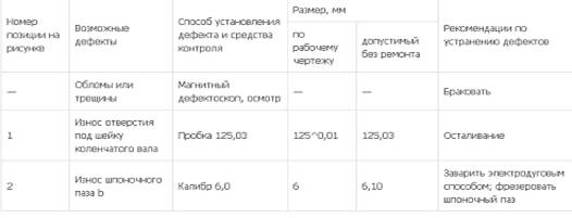 Рис. 6. Схема установки втулок для центробежной очистки масла внутри коленчатого вала:1 — шатунная шейка коленчатого вала; 2 — бронзовая втулка; 3 — заглушка; 4, 6 — масляные каналы; 5 — отстой Заглушки коленчатого вала при капитальном ремонте подлежат 100 %-й замене. Извлекаются они из своих гнезд перед мойкой коленчатого вала специальным съемником. Коленчатые валы при поступлении в углубленный текущий или капитальный ремонт могут иметь следующие дефекты: обломы и трещины; изгиб вала (5—10 % от общего количества коленчатых валов, поступающих в капитальный ремонт); износ коренных и шатунных шеек. 2.4 Технические условия на контроль, сортировку и восстановление коленчатых валов и противовесов Дефектация, восстановление коленчатых валов и контроль их после восстановления осуществляются на основании технических условий. Технические условия на контроль, сортировку и восстановление коленчатого вала представлены в табл. 3, а противовесов — в табл. 4.