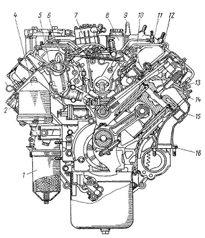 Рис. 2. Поперечный разрез двигателя КамАЗ-740.10: 1 - фильтр полнопоточный очистки масла; 2 - горловина маслозаливная; 3 -указатель уровня масла; 4 - фильтр центробежный масляный; 5 -коробка термостатов; 6 - рым-болт передний; 7 - компрессор; 8 -насос гидроусилителя рулевого управления; 9 - рым-болт задний; 10 - труба водяная левая; 11 - свеча факельная; 12- воздухопровод впускной левый; 13 - форсунка; 14 - скоба крепления форсунки; 15 - патрубок выпускного коллектора; 16 - коллектор выпускной