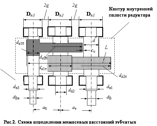 Курсовая работа: Узел редуктора электромеханического привода1.4.4 Определение межосевых расстояний с учётом габаритов подшипников Конструктивно межосевое расстояние (рис.2.1.) зубчатой пары aТ ³ 0,5(Dп1+ Dп2)+ 2g, (1.24) aб ³ 0,5(Dп3+ Dп2)+ 2g , где Dп1 Dп2 и Dп3 – наружные диаметры подшипников качения соответственно выходного вала, промежуточного вала и входного вала; 2g – минимальное расстояние между внешними кольцами подшипников, принимается в зависимости от диаметра болтов, соединяющих верхнюю крышку и корпус редуктора. Диаметр болта должен быть