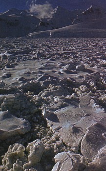 Паковый лед (pack ice), монолитные массы дрейфующих льдин (морской лед) разл. возраста - сплошных или с прогалинами, - сбитых вместе волнами и ветром. Сжатие ледовых полей, их давление на берега и мелководные участки приводят к образованию хаотичных нагромождений льда - торосов. |